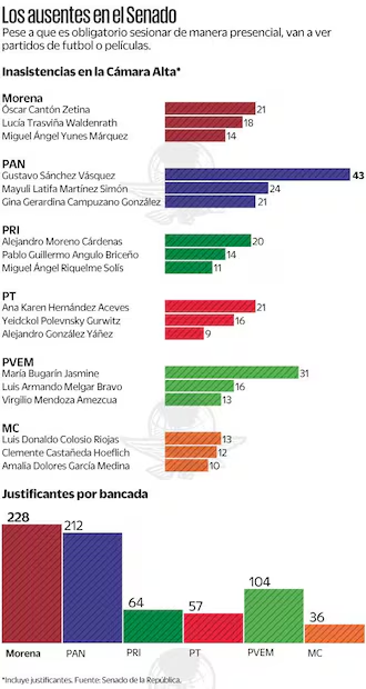 En el caso de la senadora Martínez, su registro la coloca inmediatamente detrás del panista Gustavo Sánchez Vázquez y de la legisladora del PVEM Jasmine María Bugarín, quienes encabezan la lista de mayor ausentismo.