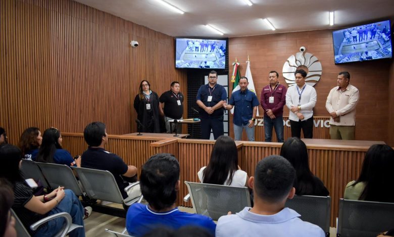 El secretario general del Ayuntamiento de Benito Juárez, Pablo Gutiérrez Fernández, recibió a estudiantes de Derecho del Grupo Tecnológico Universitario en las instalaciones de los Juzgados Cívicos, donde realizaron un recorrido para conocer de cerca cómo funciona este modelo de justicia.
