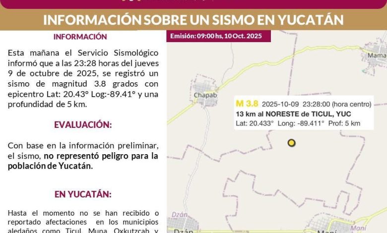 El evento ocurrió a las 23:28 horas y, según informó la Coordinación Estatal de Protección Civil de Yucatán (Procivy), no representó peligro para la población. Hasta las primeras horas de este viernes, no se habían reportado daños materiales en los municipios cercanos, como Ticul, Muna, Oxkutzcab y Dzan.